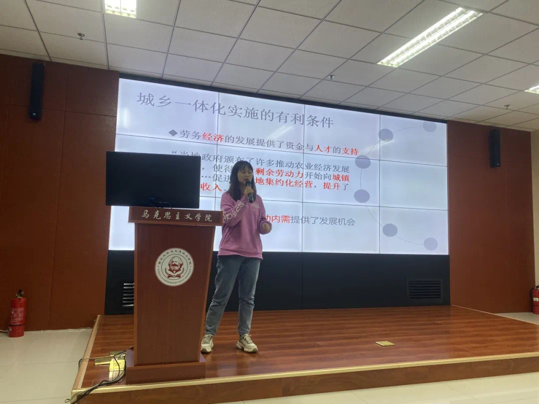 黄怡结合自己家乡的实际情况和时代热点,为大家分享了论文《城乡一体化背景下的新农村建设研究》,在展示文章内容的同时,提到很多现实问题,引起了同学们的共鸣,激发大家对城乡建设的思考。