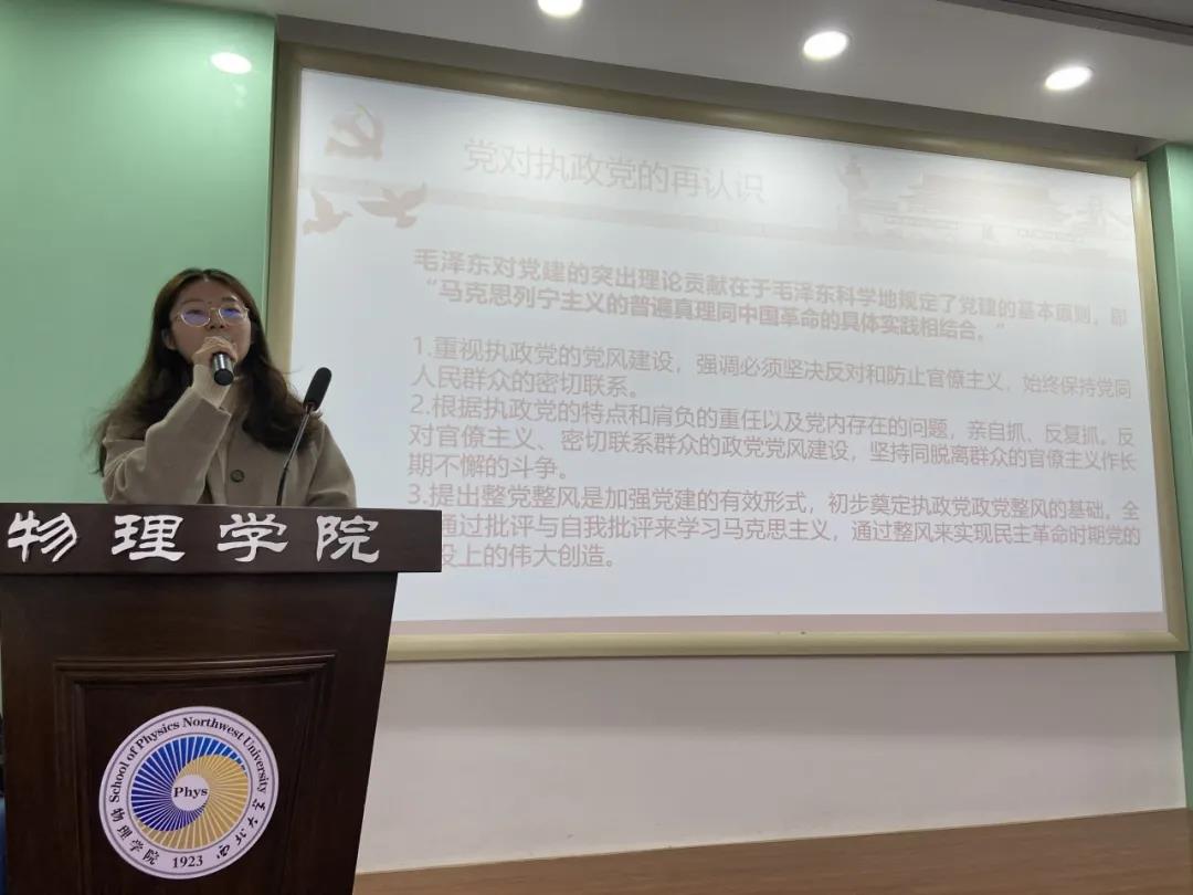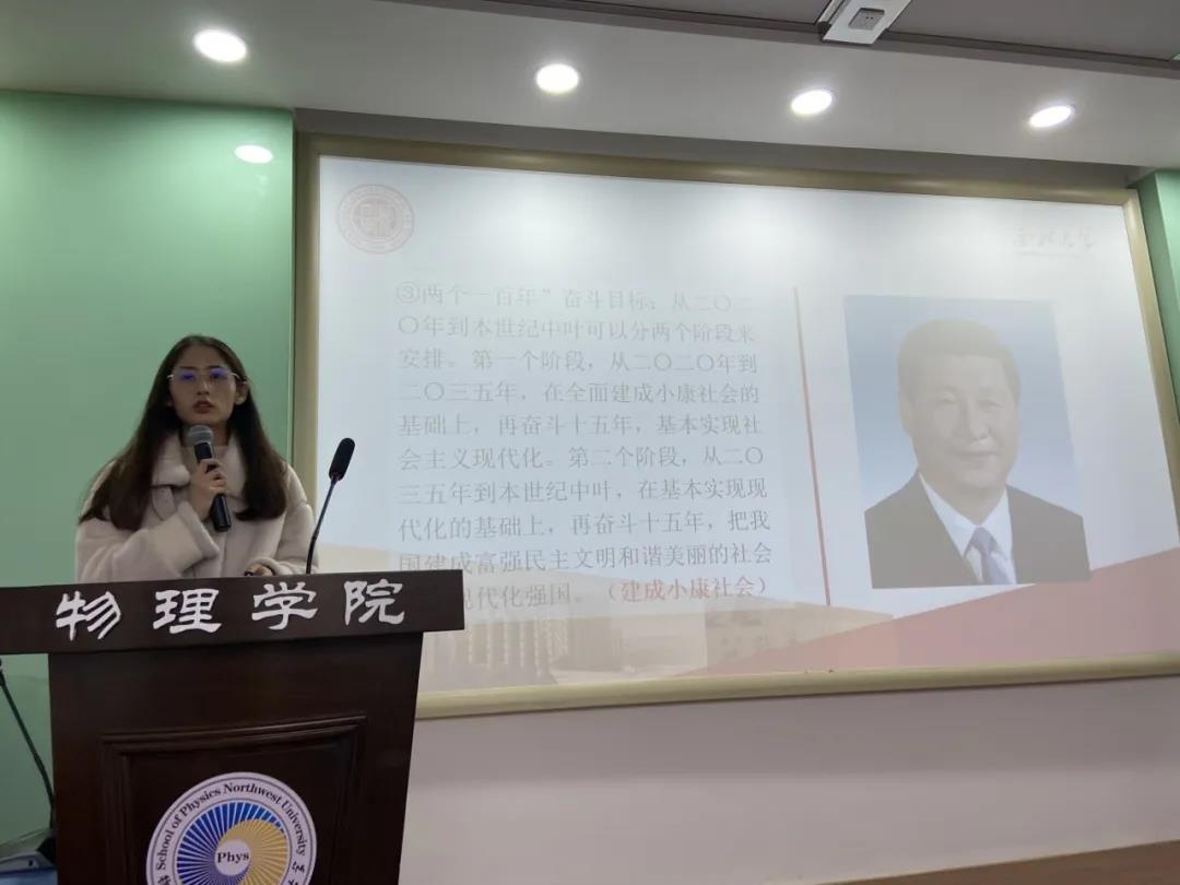 11月17日中午,雷竞技官网“红桅杆”思政理论学习社团受物理学院团委邀请,在物理学院进行了理论宣讲。本场活动的主讲人分别是2019级中国史专业于溪、2020级思想政治教育专业辛欣和毛苓萱。
