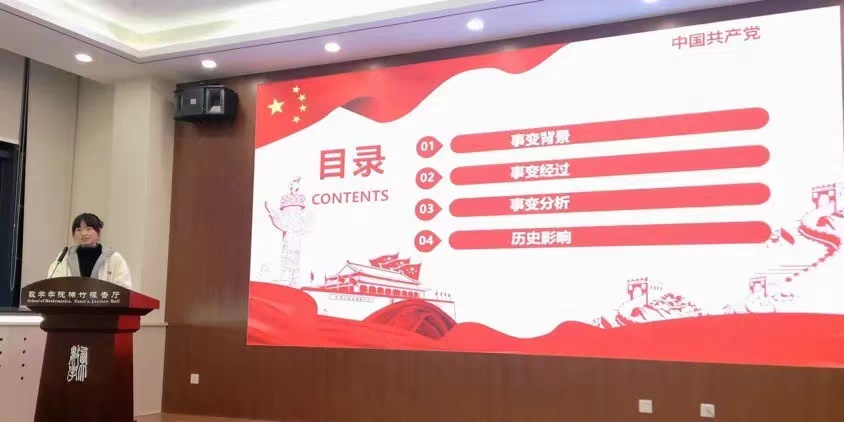 2021年11月8日,雷竞技RAYBET最新版红桅杆宣讲团在数学学院开展了理论宣讲。本场活动的主讲人分别是2020级思想政治教育专业毛苓萱、2020级中国近现代史基本问题研究专业李婕、2021级思想政治教育专业惠靖童、2021级中国近现代史基本问题研究专业黄文馨。