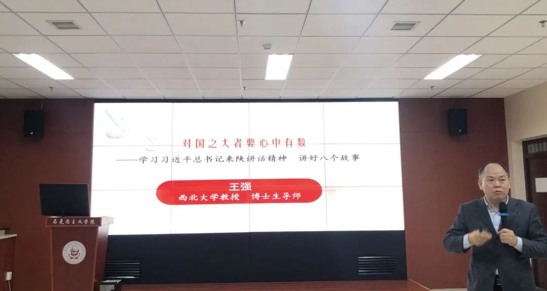 王强教授以《对国之大者要心中有数——学习习近平总书记来陕讲话,讲好八个故事》为主题,深入解读了习近平总书记来陕西考察时的重要讲话精神。围绕着讲好“绿色发展故事”、“生态文明故事”、“红色文化故事”、“教育强国故事”、“传统文化故事”、“脱贫攻坚故事”、“军事强国故事”、“体育强国故事”展开了详细论述。王强教授嘱咐同学们要认真学习并贯彻习近平总书记来陕考察重要讲话和重要指示精神,不忘初心、牢记使命,以新时代追赶超越的新气象、新作为来回报总书记的关心和厚爱。同时,王强教授指出,各位同学要勇于担负起新时代赋予青年学子的历史使命,用爱国引领理想、用奋斗创造未来,以青春力量在历史的新征程上绽放绚丽之花,为实现中华民族伟大复兴的中国梦贡献力量。