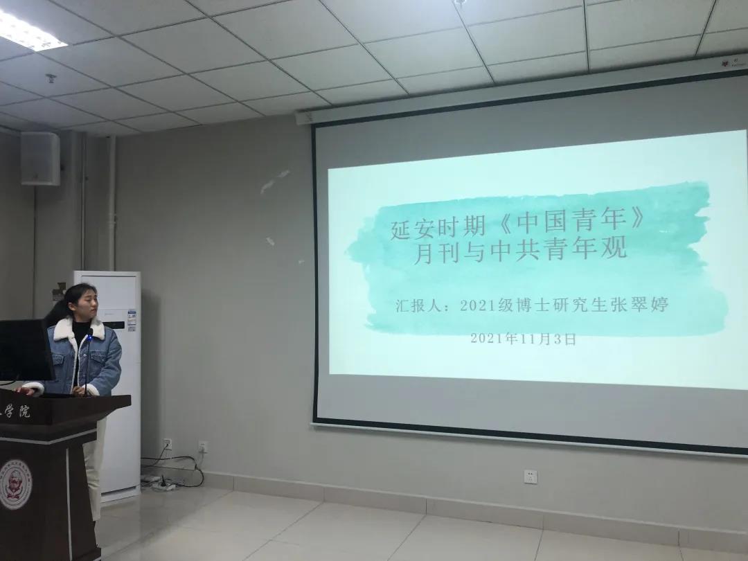 张翠婷同学以《延安时期<中国青年>月刊与中共青年观》为主题,系统梳理了中共青年报刊的历史发展脉络,介绍了延安时期《中国青年》月刊的复刊实况,同时说明了月刊与中共青年观之间的关系。此次分享深化了同学们对青年观的认识和理解。