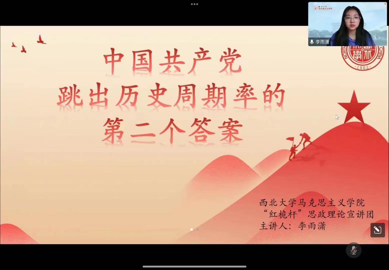 李雨潇以《中国共产党跳出历史周期率的第二个答案》为题,讲述了中国共产党百年来以实际行动刀刃向内、自我革命的光辉历程,让同学们深入领会自我革命是中国共产党不变质、不变色、不变味的重要品质。