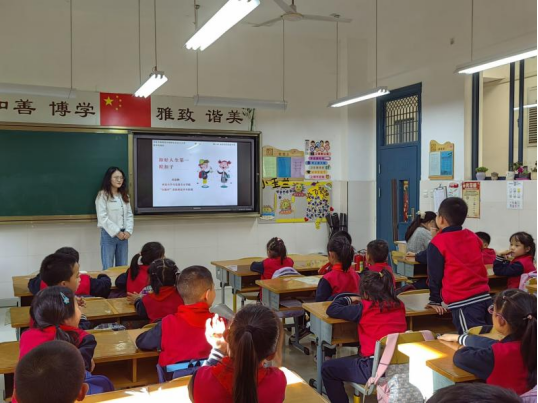 刘莹在以《美丽中国是我家》为主题的讲解中,通过图文和视频的方式向同学们介绍了中国的全称、认识了中国的地图、国旗、国徽和国歌,在轻松的课堂氛围中加深了同学们对祖国的了解,增强了民族认同感和自豪感。