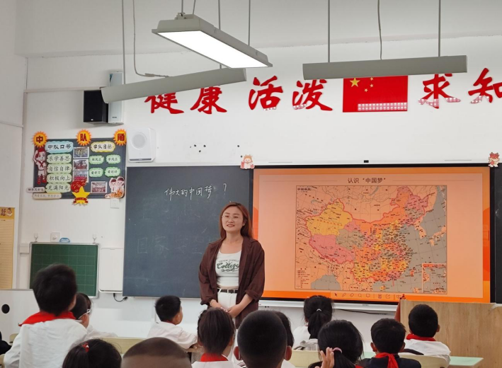 崔艳文以《美丽中国是我家》为题,主要通过介绍国旗的含义、国徽的构成以及国歌背后的故事以此培养学生的爱国情怀。