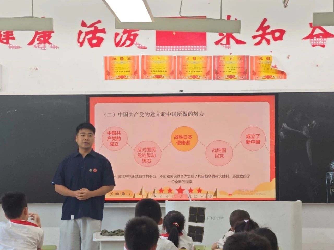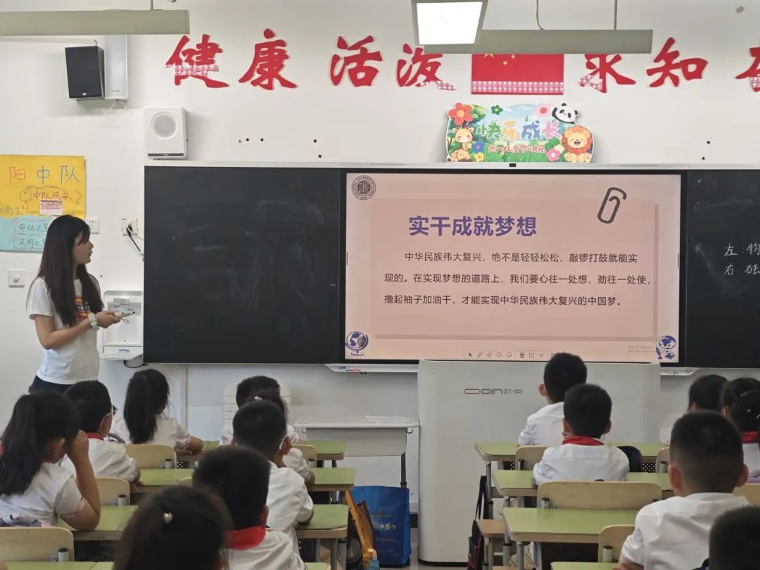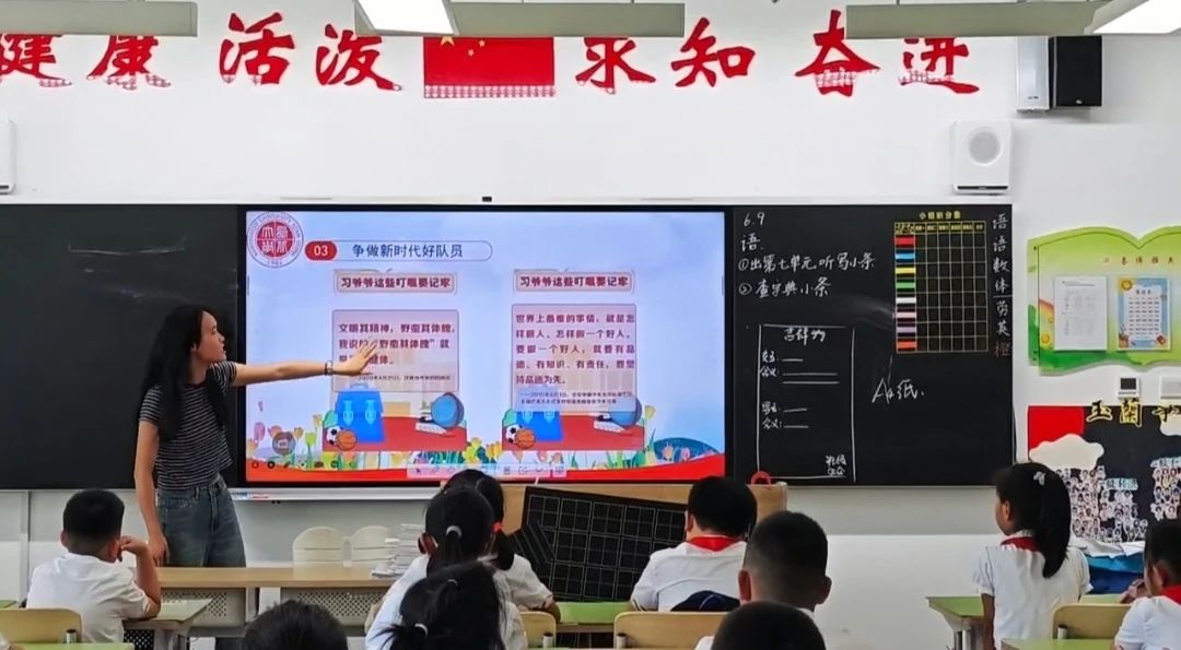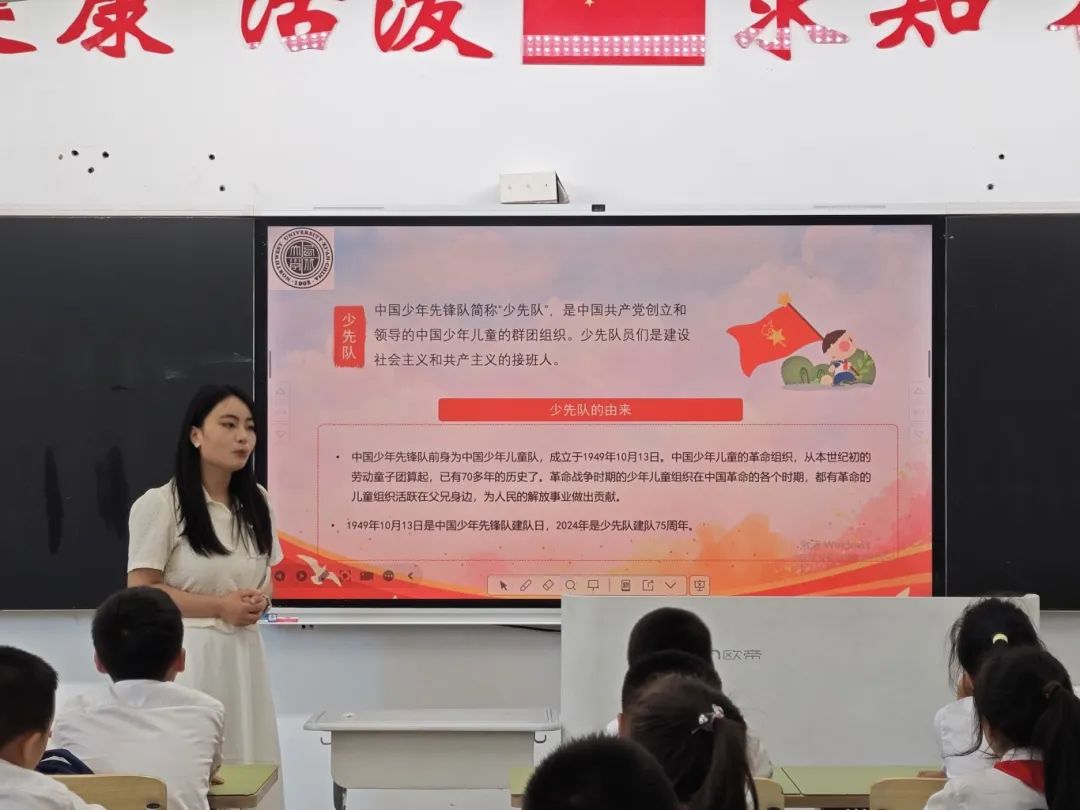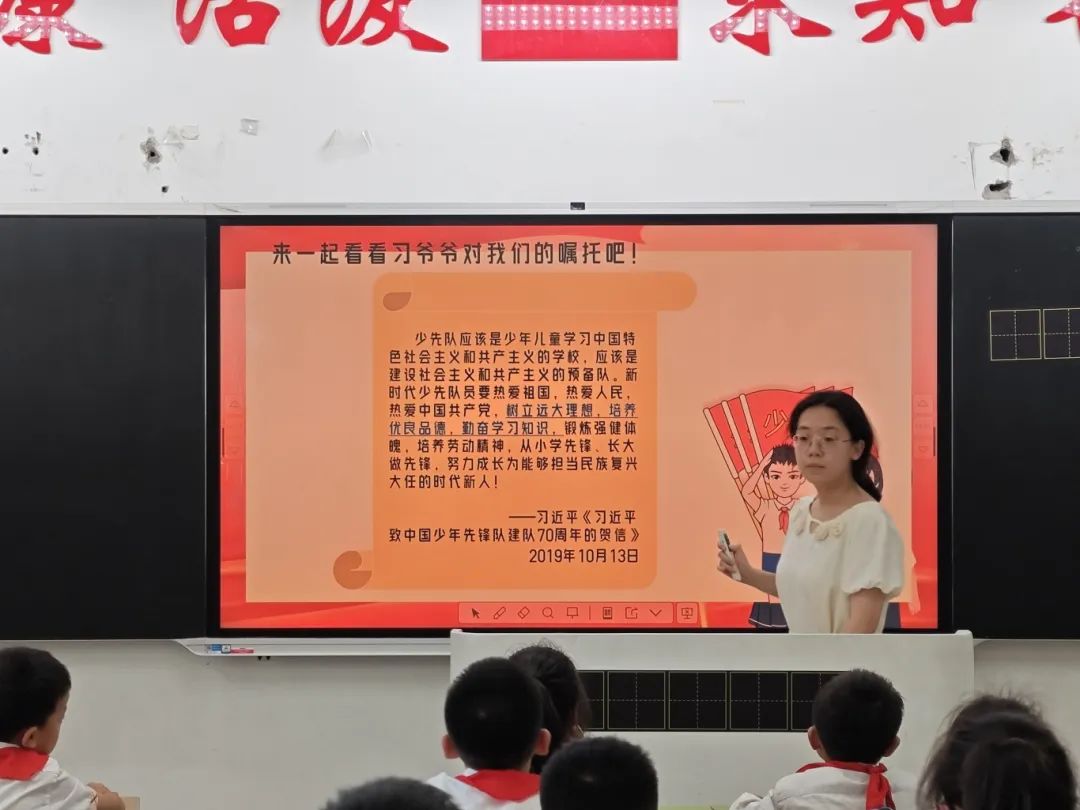 燕卉雅以《光荣的少先队》为题,讲述了少先队队旗和红领巾的含义,启发同学们听党话跟党走,以实际行动让胸前的红领巾更加鲜艳。