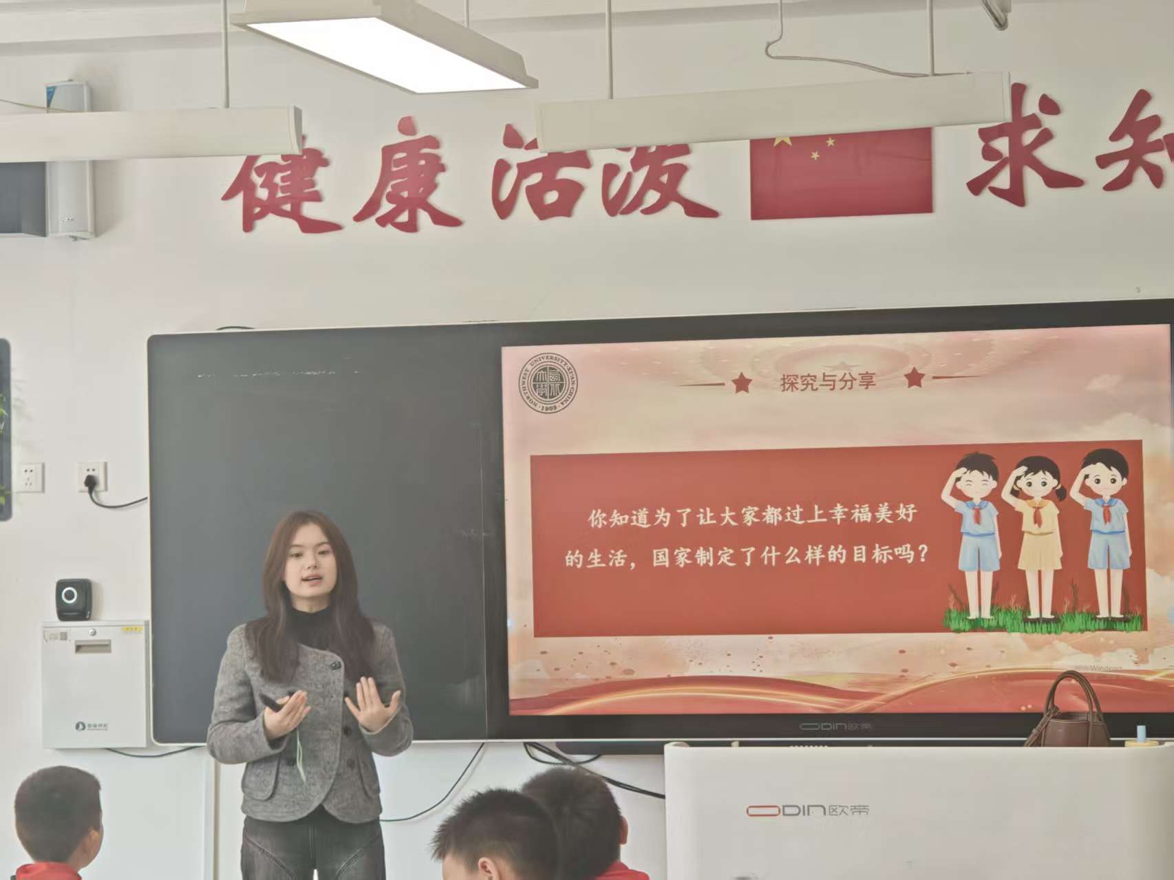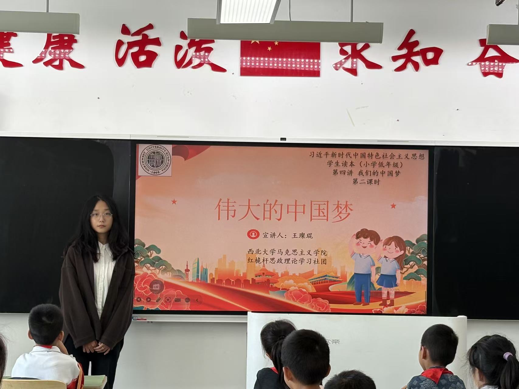 陈俊如以《新时代 新生活》为题,以丰衣足食、交通便利、科技发达、环境优美作为切入点,让学生们了解了新时代下人民的新生活,感受我国社会主义建设取得的伟大成就,激发了学生的爱国之情。