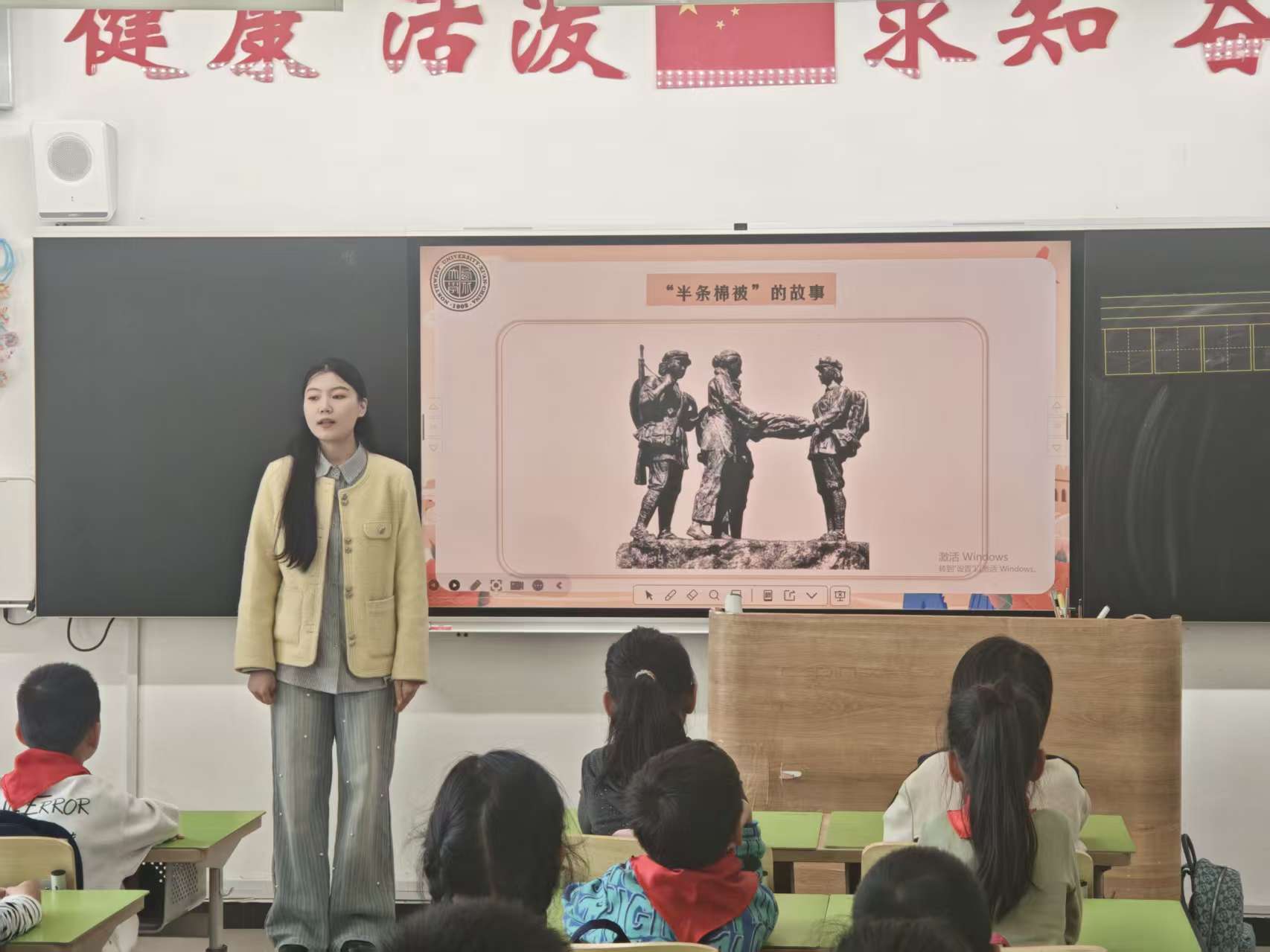 杨若莺以《光荣的少先队》为题,介绍了少先队的创立者和领导者,解释了队旗的象征意义,带领同学们回顾了入队仪式,鼓励队员们践行誓言,努力成长为新时代的优秀少先队员。