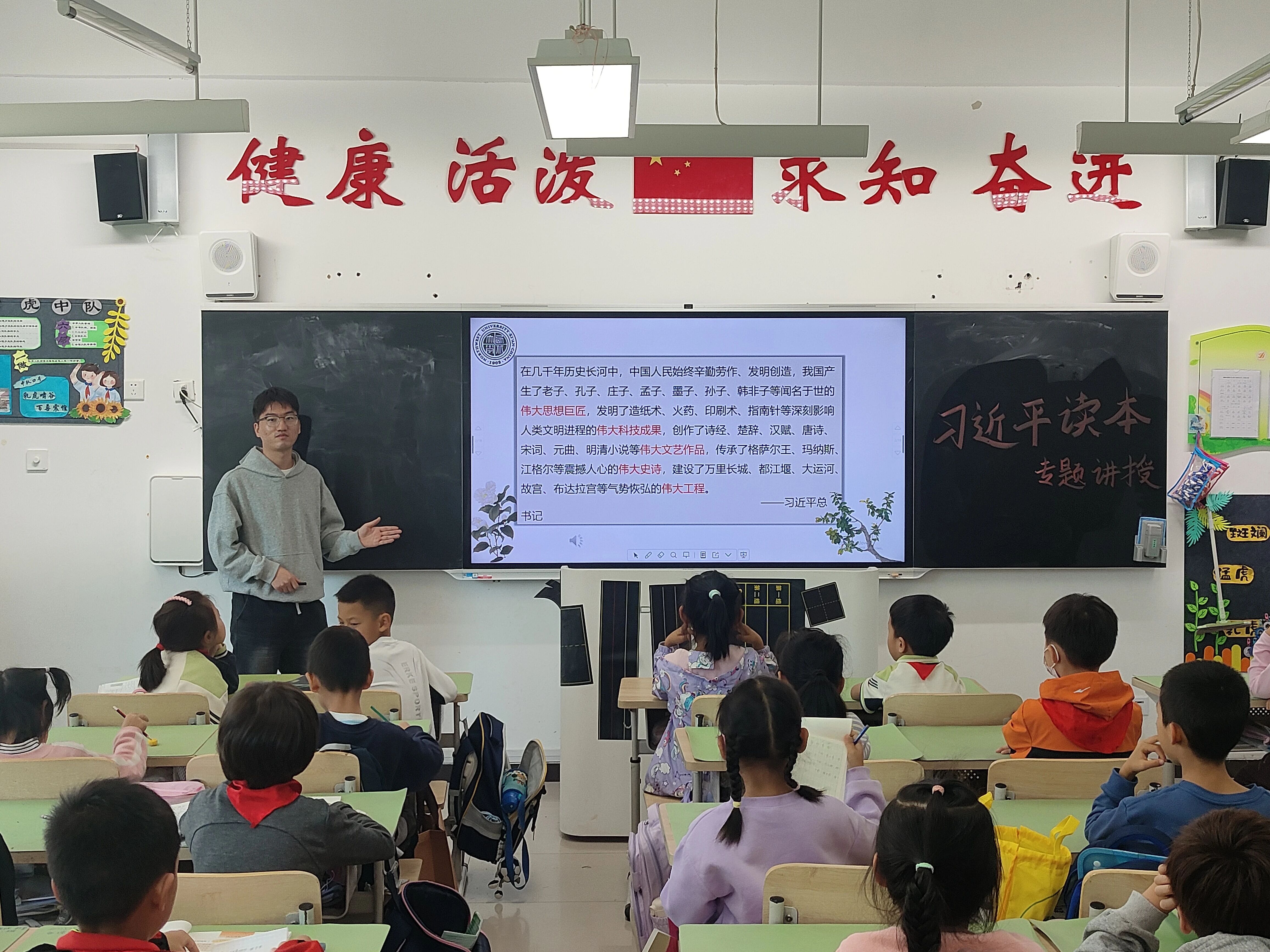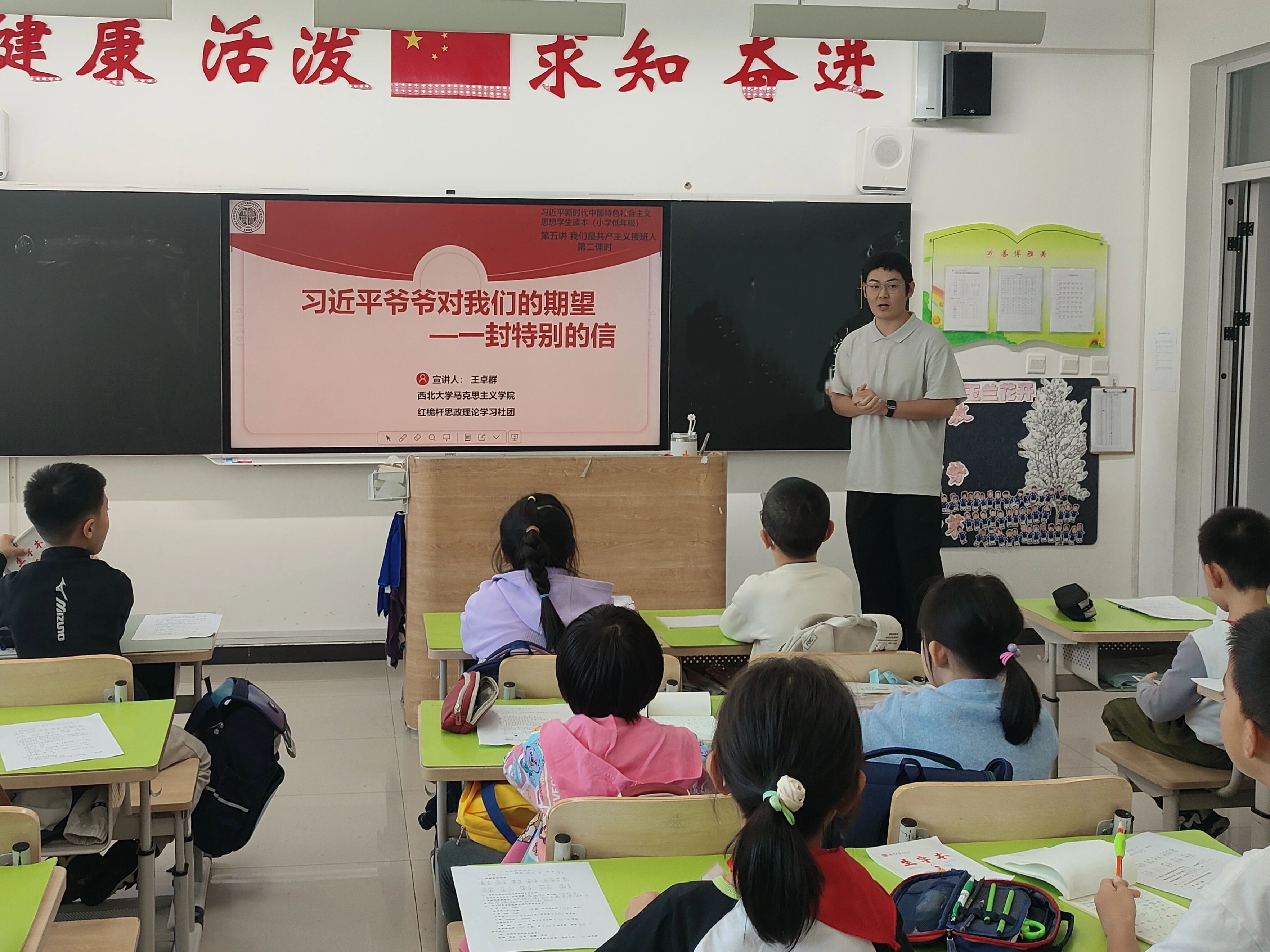 9月24日,雷竞技官网红桅杆思政理论学习社团在西安市长安区第一小学实验小学,以《习近平新时代中国特色社会主义思想学生读本》(小学低年级)为主要内容,为二年级的小学生讲授思政课。主讲人分别是来自2024级和2025级的马克思主义基本原理、思想政治教育、马克思主义中国化研究与中国近现代史基本问题研究专业的12名硕士研究生。