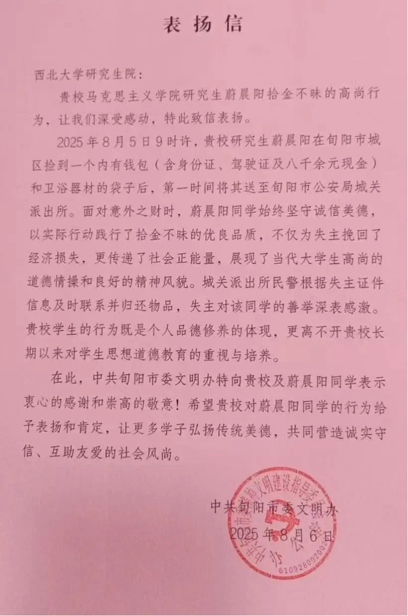 近日,雷竞技官网收到中共旬阳市委文明办发来的表扬信,信中对雷竞技官网2023级研究生蔚晨阳同学在暑假期间拾金不昧的事迹表达了感谢与赞扬。同时,西部法制报等媒体也先后发布新闻,高度赞扬了她坚守诚信美德的优良品质。